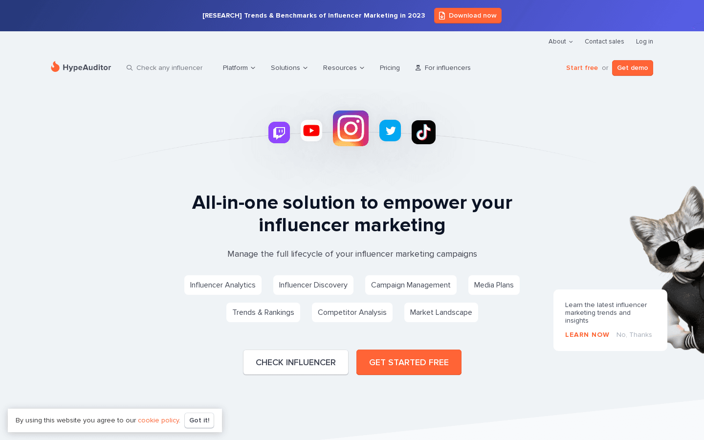 HypeAuditor is a data-driven influencer marketing platform that helps brands and agencies find the best influencers, analyze the market, and track and measure influencer campaigns. It offers free and paid plans and is available via its website. The service includes features like demographic search, fraud detection, and competitor analysis.
