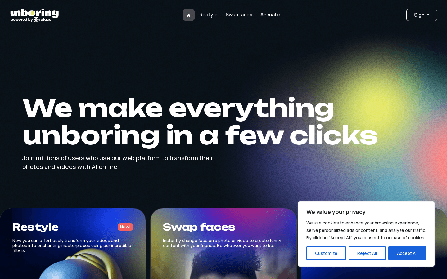 Unboring.ai is an AI-powered online service that allows you to easily animate photos, swap faces, and even swap faces in videos. With both free and paid plans available, you can create stunning and eye-catching animations. Simply visit their website to get started.