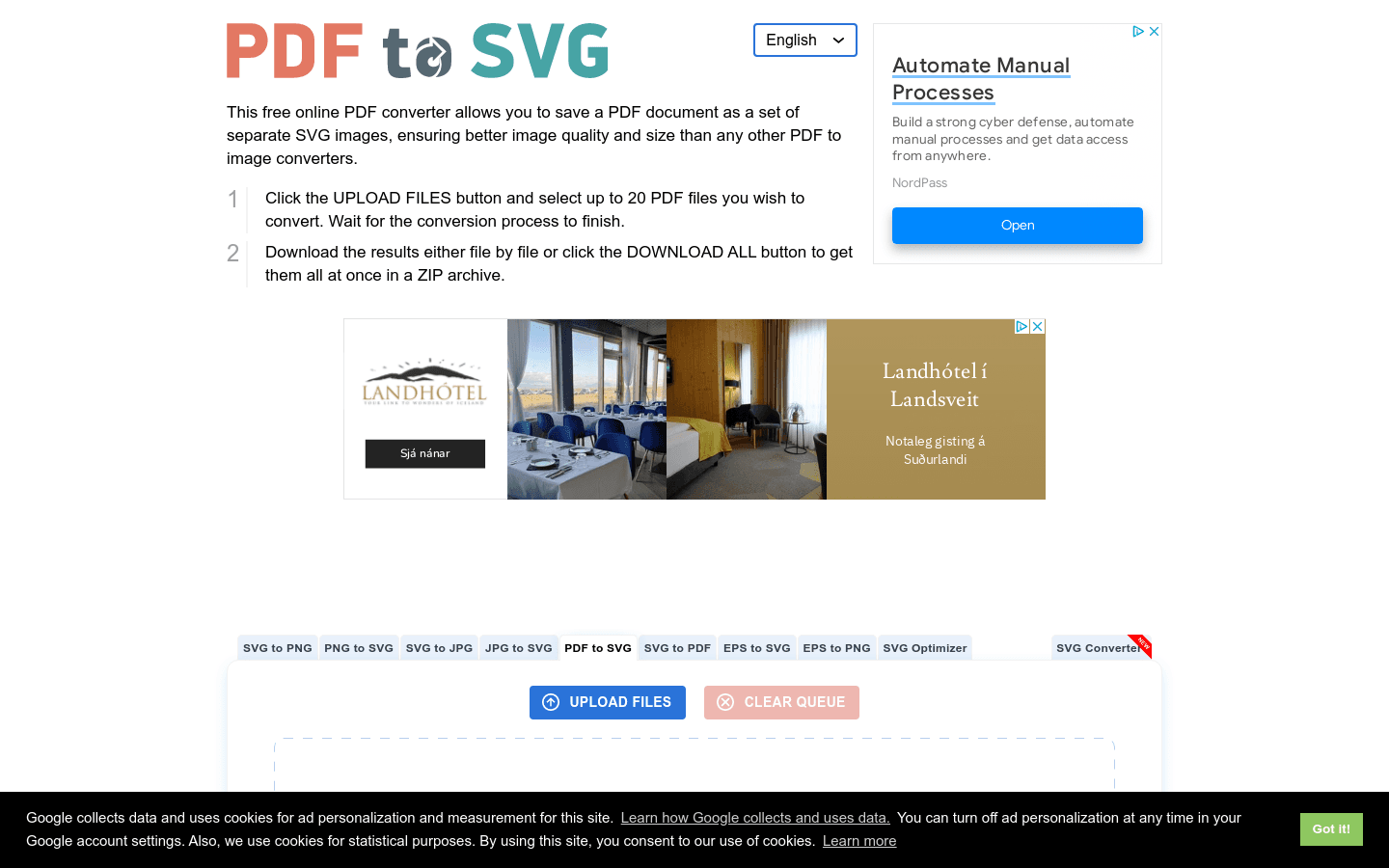 Convert PDF to SVG with PDF To SVG. This free online tool allows you to convert a PDF document into a set of optimized SVG images. Simply upload your PDF files and download the converted SVG images.
