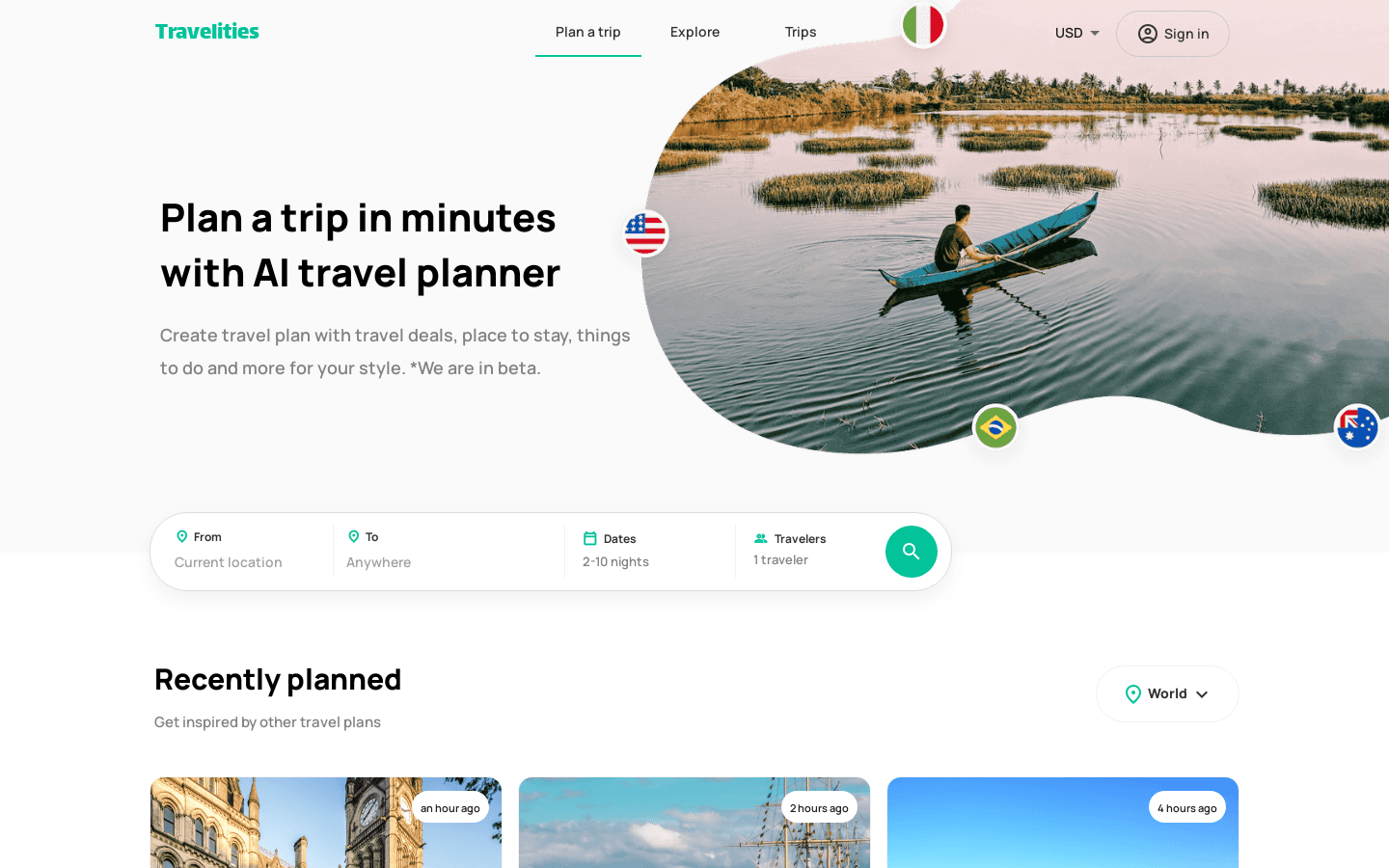 Travelities is an online service that helps you create a personalized travel plan and guide for free. With around 20,000 monthly visits, their AI travel planner offers travel deals, places to stay, things to do and more, tailored to your style.