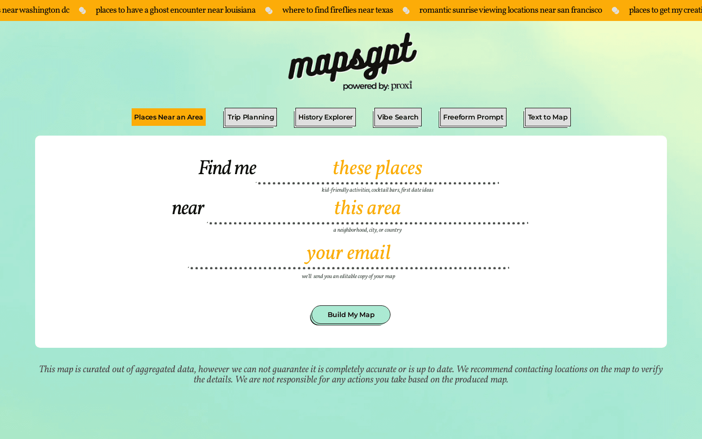 Mapsgpt is a free website that helps you create a travel plan and find a great place to visit. With around 90000 monthly visits, the service requires an email to use. Please note that the map is curated from aggregated data and may not be completely accurate or up-to-date.