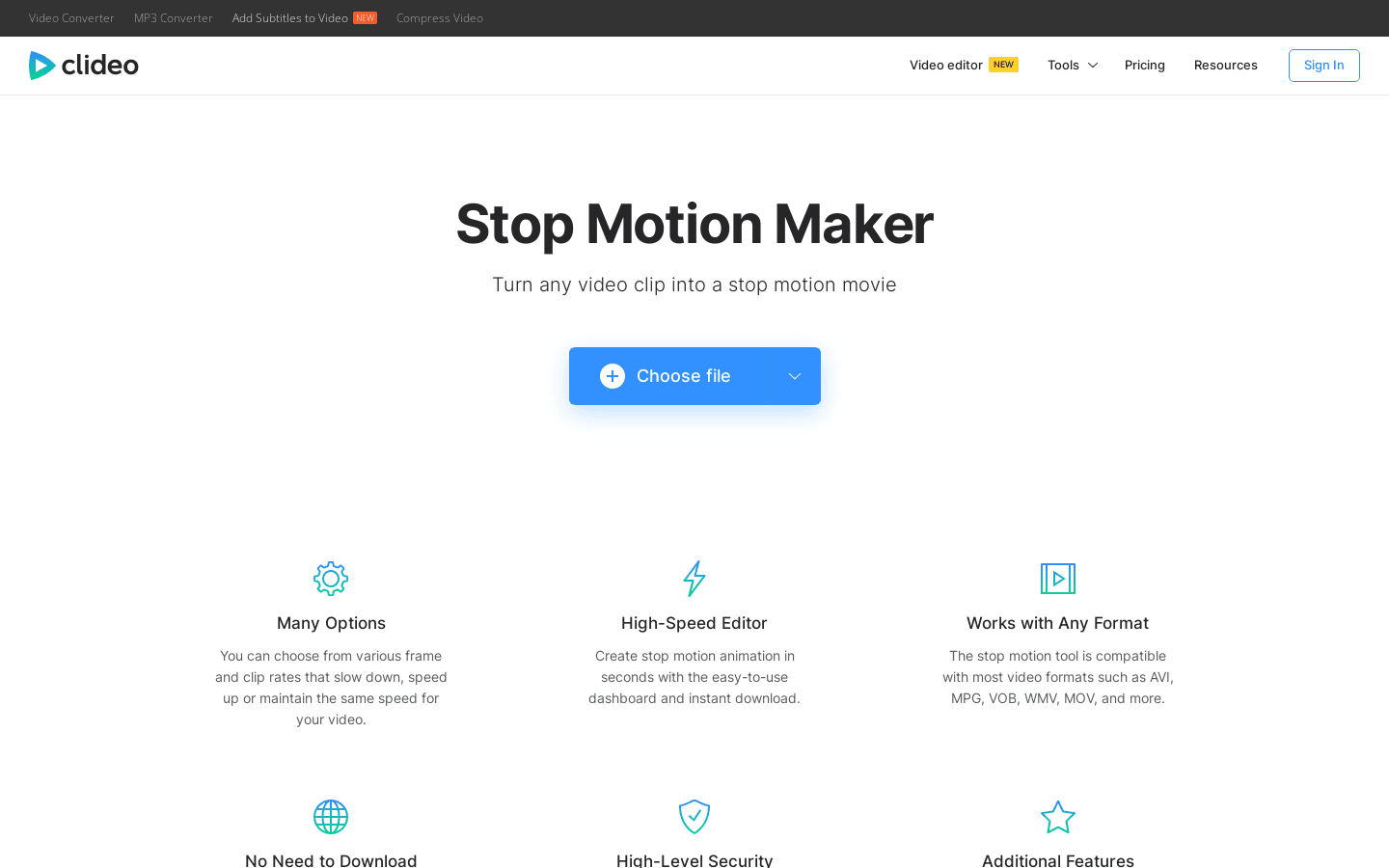Stop Motion Maker by Clideo is a free online service that allows you to turn any video clip into a stop motion movie. With various frame and clip rates, the high-speed editor creates stop motion animation in seconds. However, account registration is required.