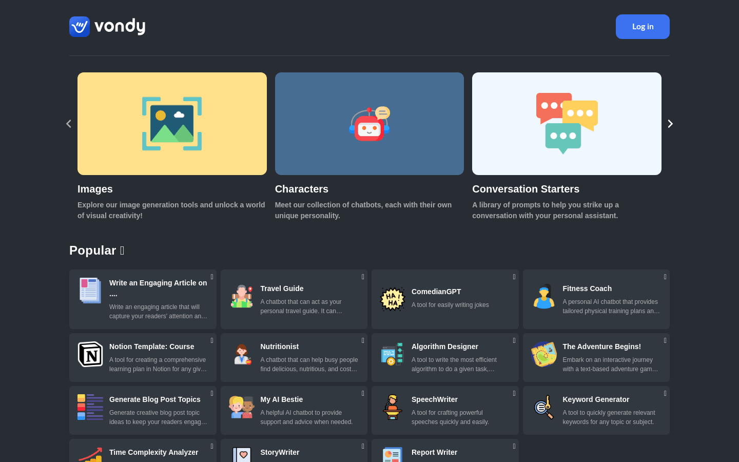 Vondy is a next-generation AI app available on its website. It offers a range of tools to generate startup ideas, keywords, blog post topics, and YouTube video ideas. It also allows users to chat with characters and create video descriptions. The service has free and paid plans, but users need to register with an email and social auth. With around 200000 monthly visits, Vondy is a great tool for those looking to boost their productivity.