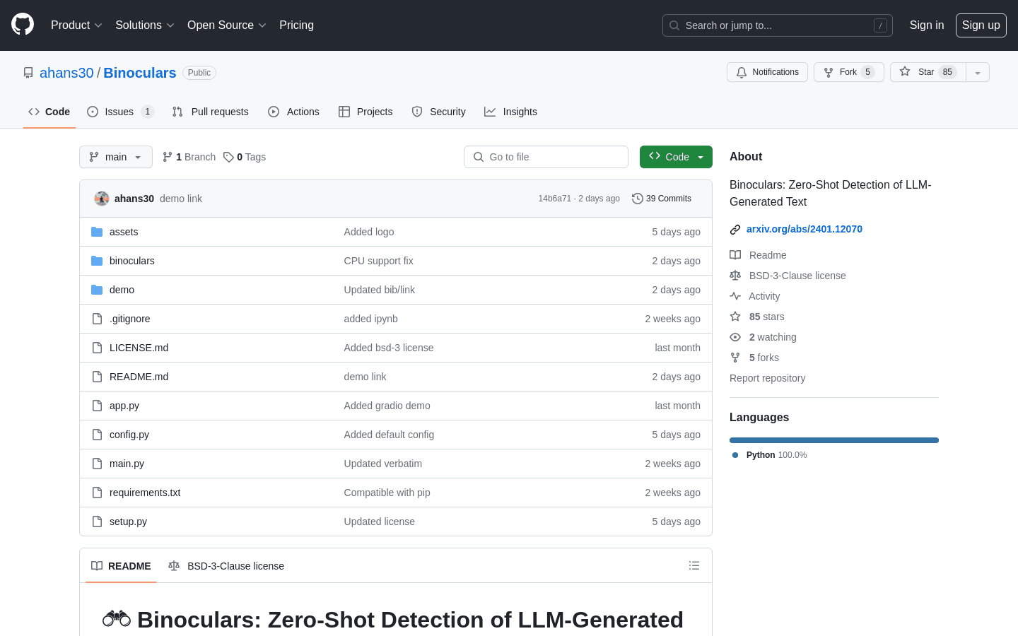 Binoculars is a free online service available on GitHub that offers zero-shot detection of LLM-generated text. It is a state-of-the-art method that requires no training data and is based on the overlap in pretraining datasets.