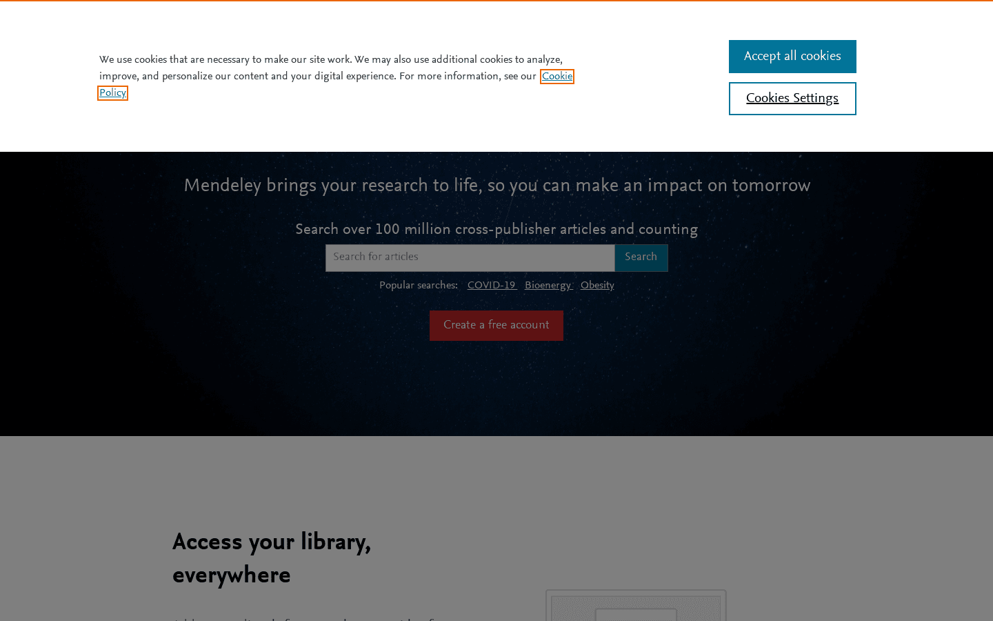 Mendeley is a free online service that helps you find articles for your research. With over 100 million cross-publisher articles, you can easily search for topics like COVID-19, Bioenergy, and Obesity. You can add papers from your browser or import documents from your desktop. Access your library from anywhere using the website or the macOS, Windows, and Linux apps. Mendeley also allows you to generate references, citations, and bibliographies in various journal styles. Plus, you'll have access to 250,000 science, technology, and health jobs. Join Mendeley today and bring your research to life!