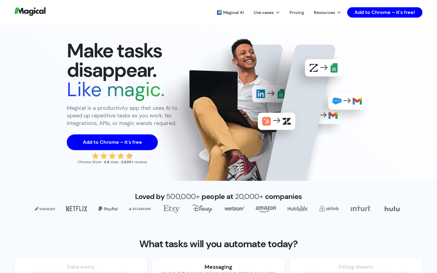 Magical is an email generator service available as an extension. It offers free and paid plans, but requires social auth, email and account registration. It automates repetitive tasks using AI to move data between tabs without integrations.