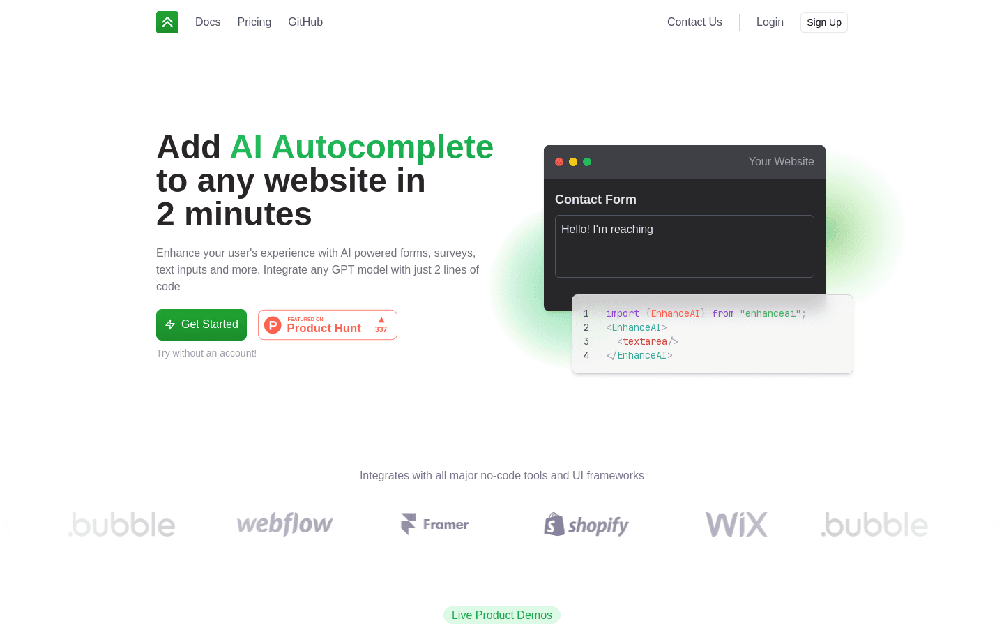 EnhanceAI is an AI-powered service that provides prompts for generative art, sales emails, and job applications. It offers both free and paid plans, and can be accessed via its website. However, users must overcome obstacles such as social auth, email, and account registration. Enhance your user's experience with GPT-powered forms, surveys, text inputs and more in just 2 minutes.