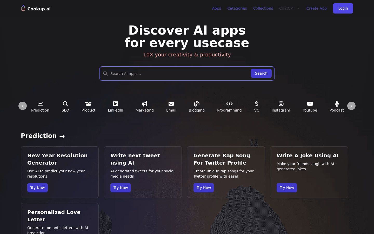 Cookup AI is a free online service that generates LinkedIn headlines, email pitches, Instagram usernames, and LinkedIn summaries from resumes. It also helps find AI apps for any use case and allows creating and distributing AI apps.