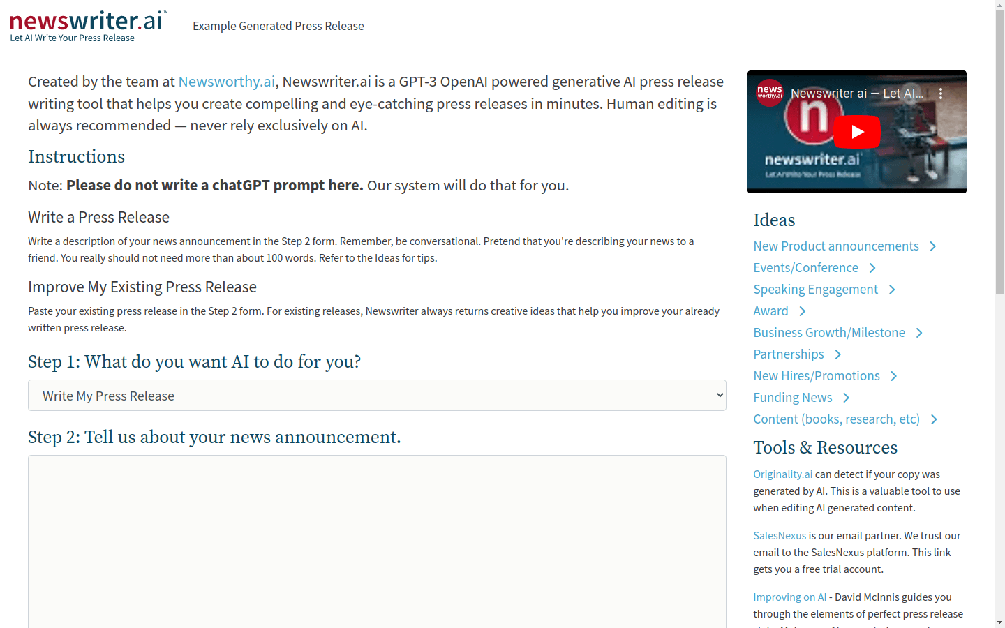 Newswriter AI is a free AI-powered press release writing service available via website. It generates compelling and eye-catching press releases in minutes. The service requires an email and captcha.