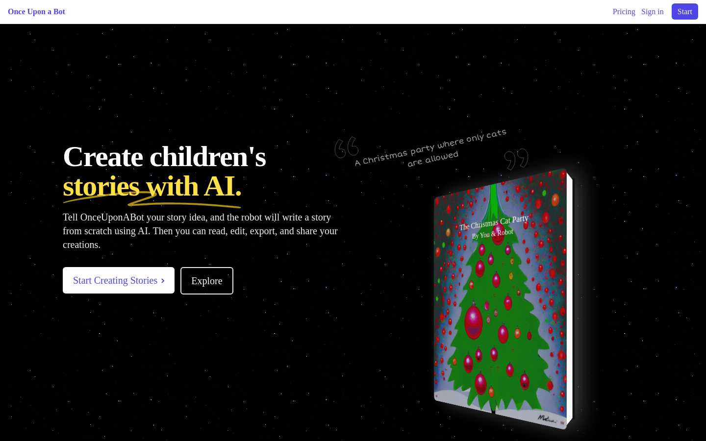 Once Upon a Bot is an online service that generates unique children's stories using AI. You can tell the robot your story idea, edit, export, and share your creation. The service has both free and paid plans, but requires email and account registration.