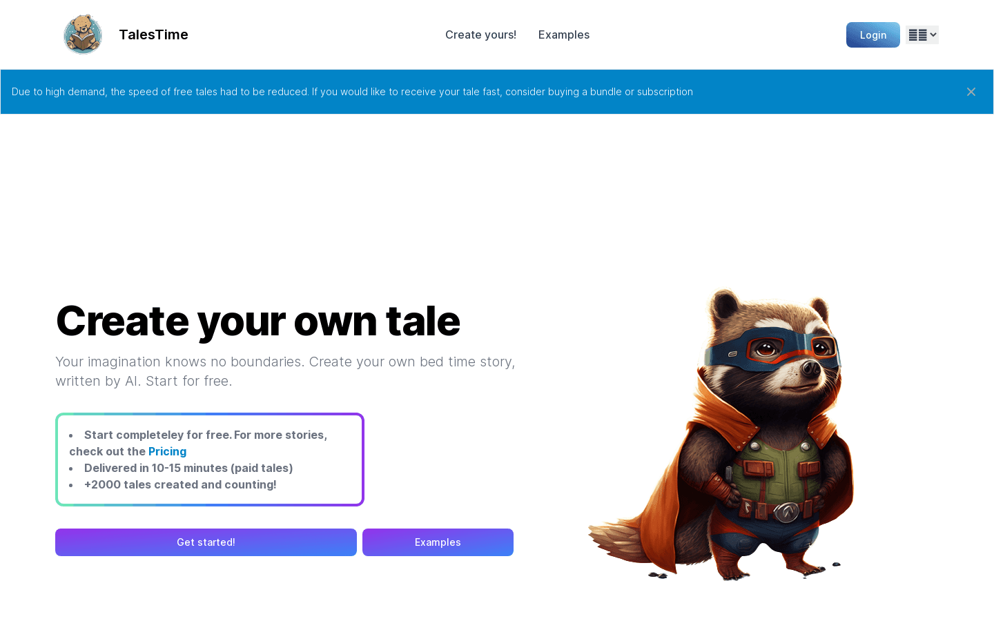 Tales Time is an online service that generates custom bedtime stories. Choose from a free or paid plan on their website. Account registration and email are required to use the service. Let your imagination run wild!