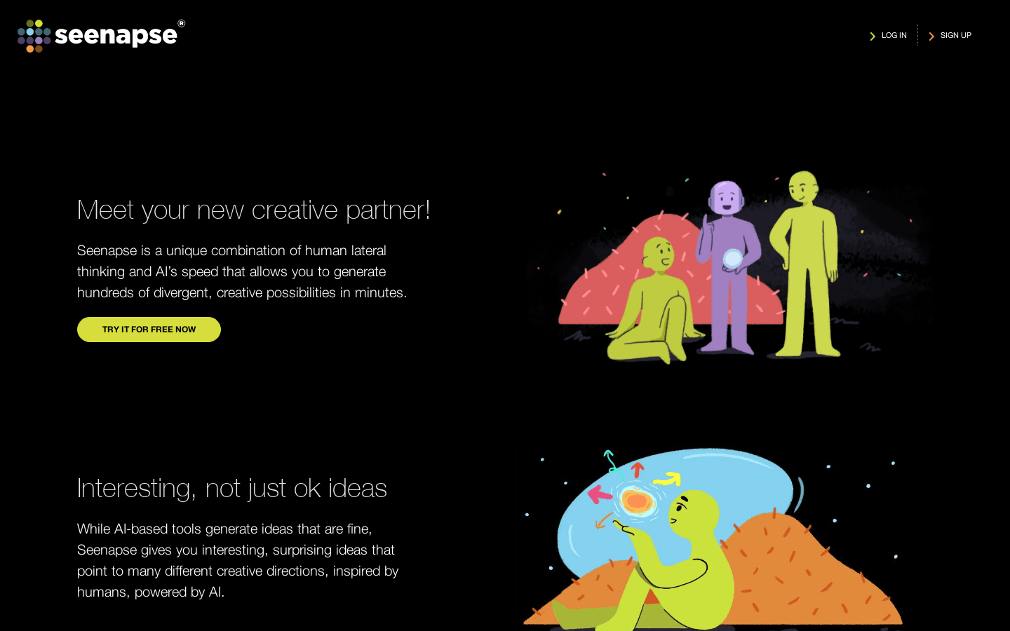 Seenapse is your new creative partner for generating ideas for social posts, video scripts, and taglines. With a unique combination of human lateral thinking and AI's speed, you can generate hundreds of creative possibilities in minutes. Try it for free now!