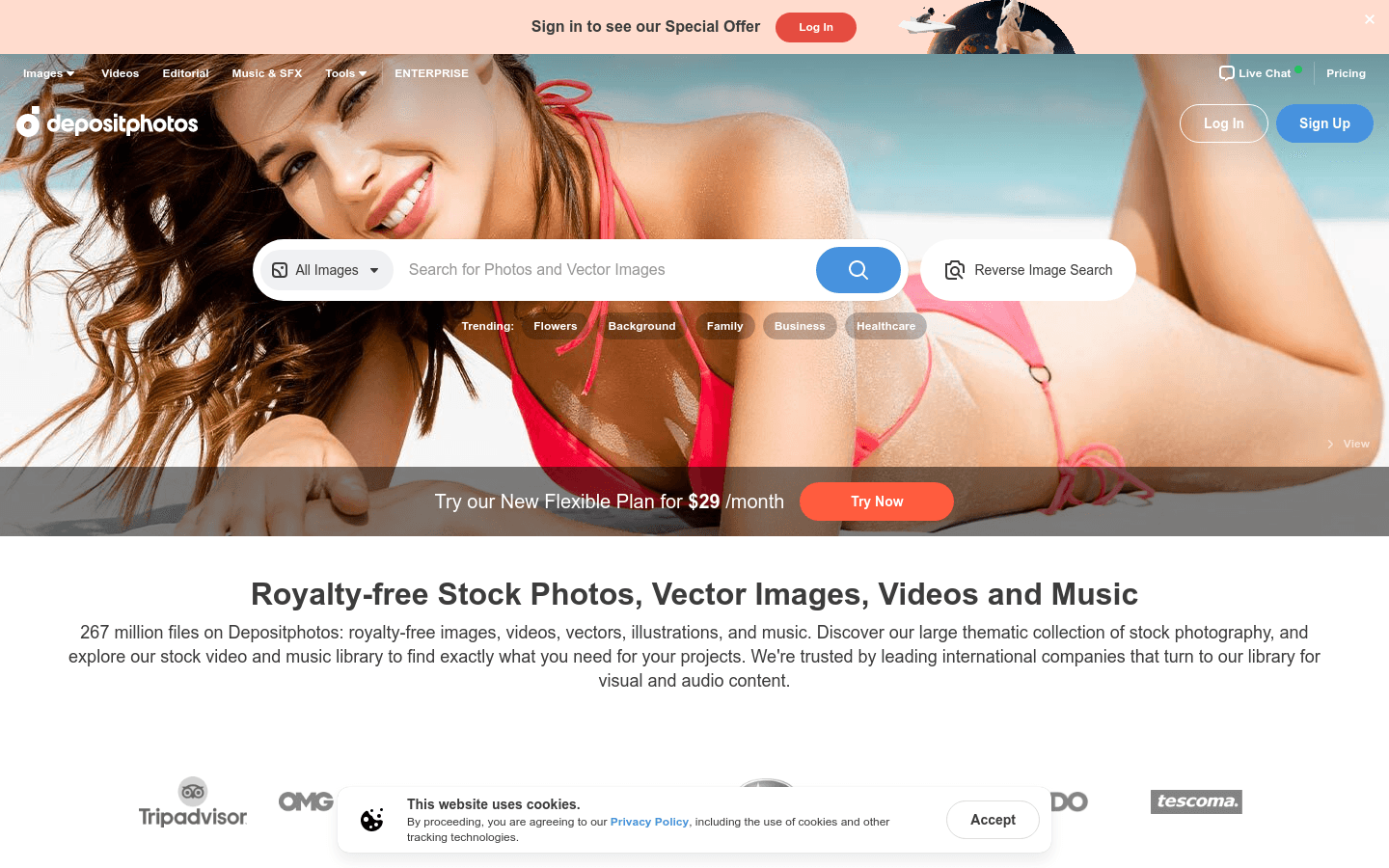 Depositphotos is an online service that offers royalty-free stock images, videos, vectors, illustrations, and music. It allows users to remove image or video backgrounds, upscale images, and find stock photos. The service is available on the website, iOS, Android, and API. It offers both free and paid plans, but social auth, email, and account registration are required. With around 15000000 monthly visits, Depositphotos is a trusted source for visual and audio content.