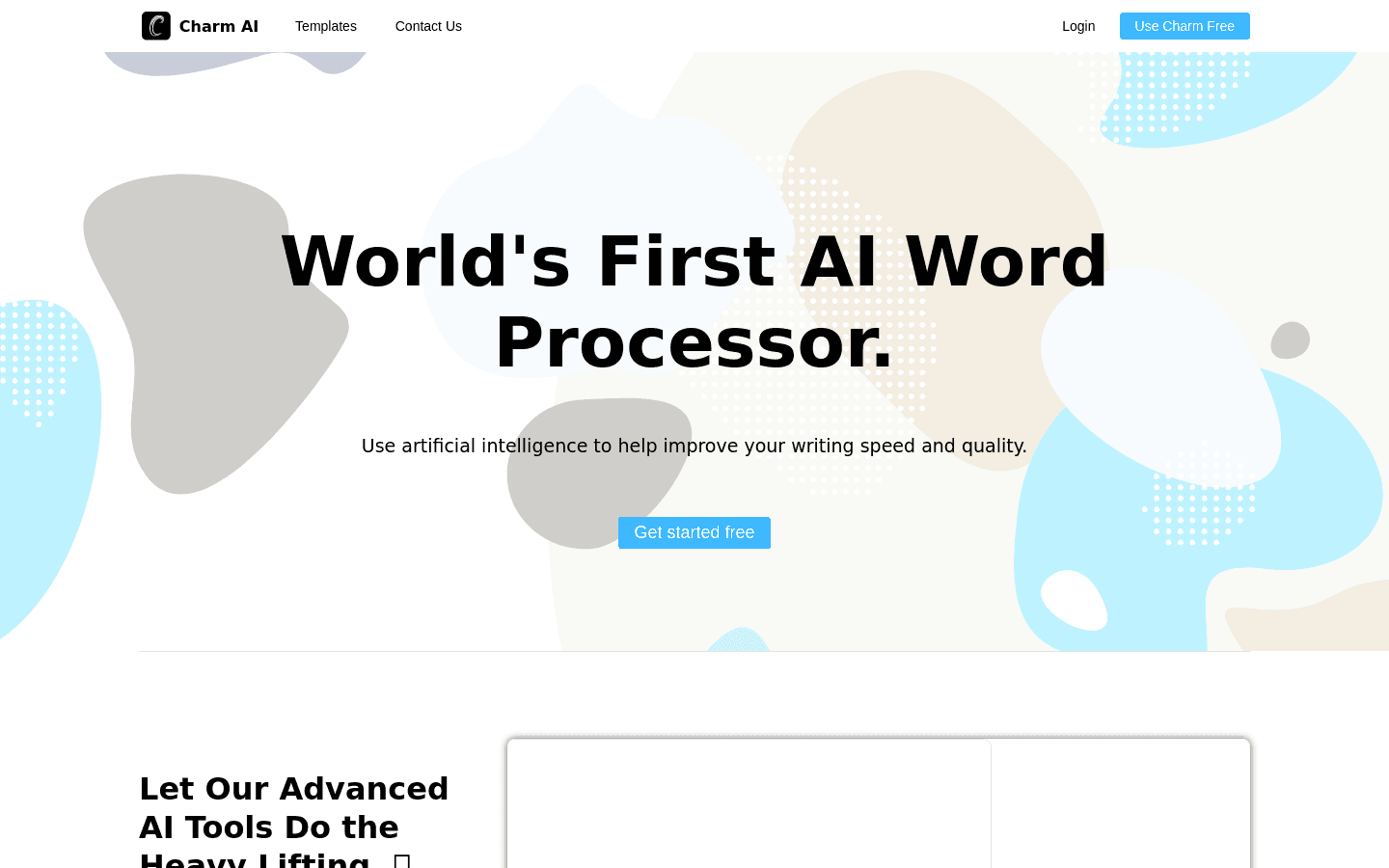 Charm AI is an online service that uses artificial intelligence to rephrase and complete text. It offers a range of features including grammar correction, story writing, and keyword extraction. The service is available via a website and offers both free and paid plans. However, users must sign up with an email and social auth to use the service. Monthly visits are around 30,000.