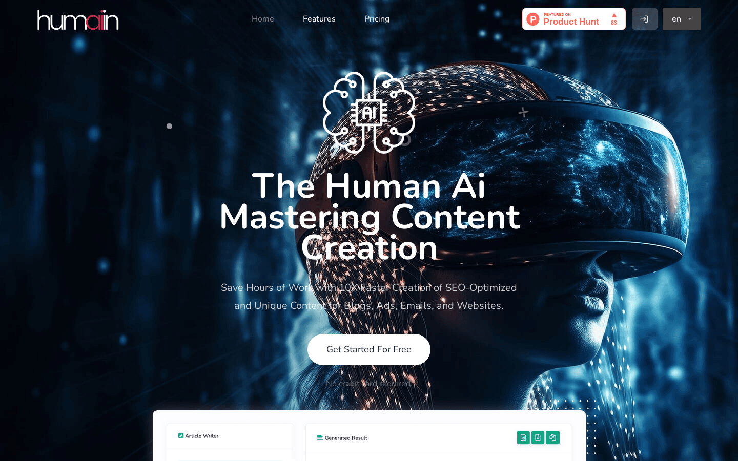 Human Ai is an online service that can convert speech to text, generate images from text, and rephrase text. It offers both free and paid plans and can be accessed through their website. However, there are some obstacles such as the need for social auth, Google sign-in, email requirement, captcha, and account registration. With Human Ai, you can save time and effort by easily creating SEO-optimized and unique content for blogs, ads, emails, and websites. It also provides auto prompts for article/blog ideas, AI chatbots for assistance, and AI-powered image generation. Streamline your workflow and unlock your creativity with Human Ai.