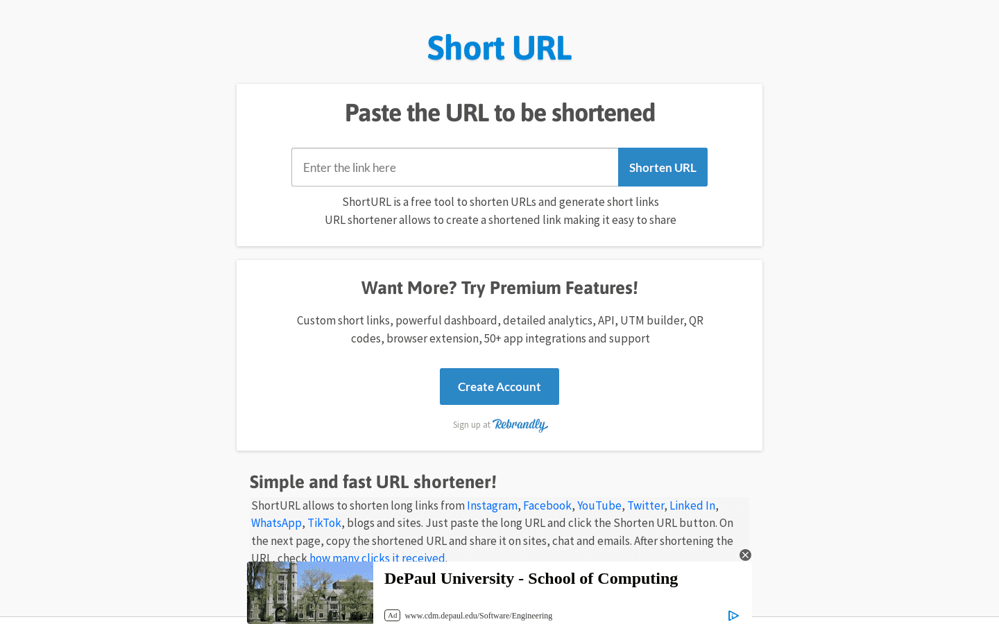 URL Shortener is a free online service that allows you to easily create short URLs for webpages. With this tool, you can customize and optimize your links, track their performance, and manage multiple URLs at once.