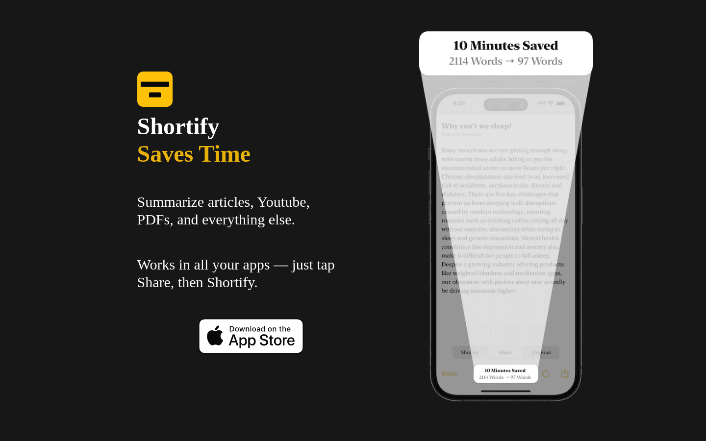 Shortify is an online service that allows users to summarize articles, Youtube videos, PDFs, and more. With both free and paid plans available, Shortify is accessible via iOS devices.