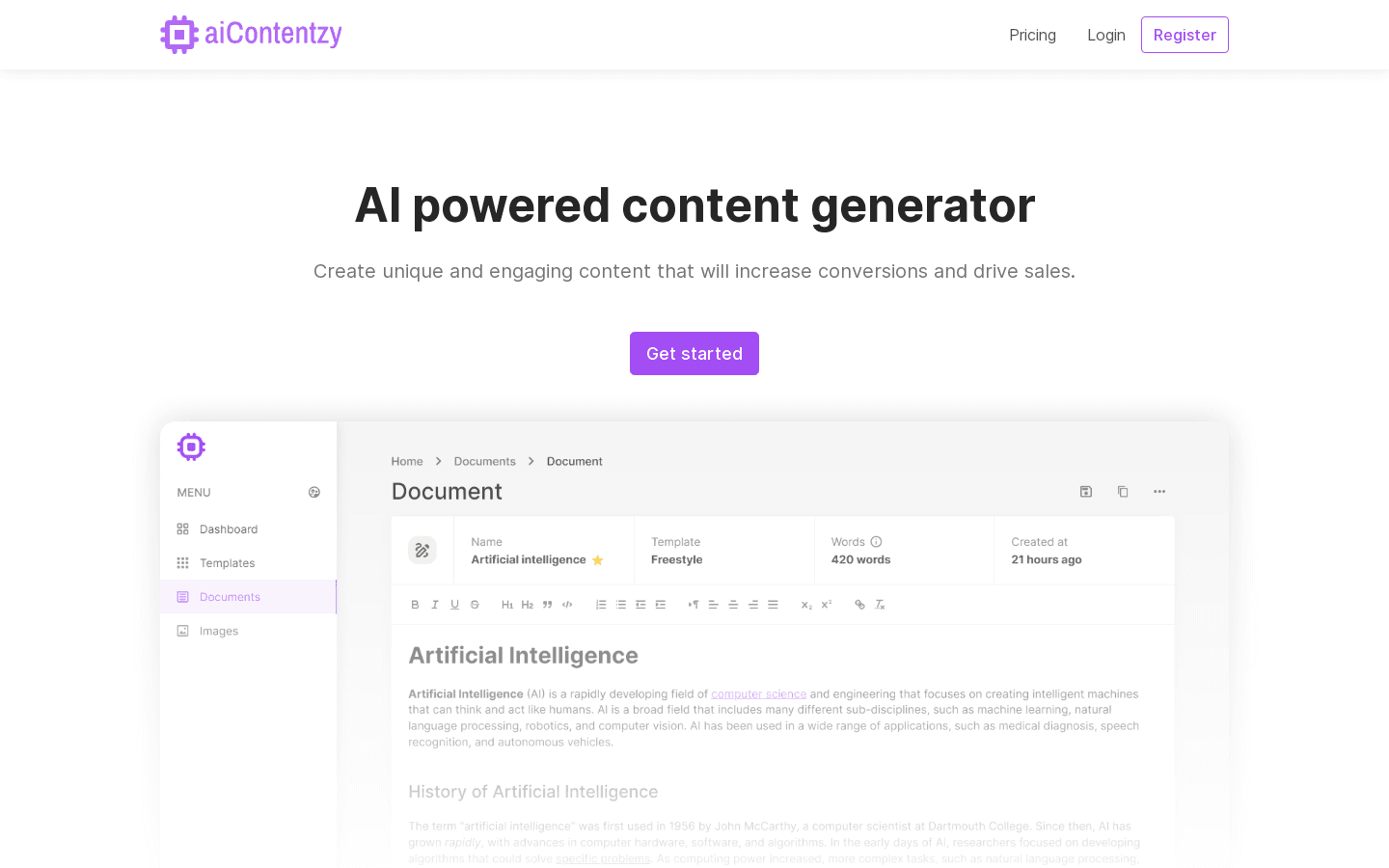 aiContentzy is an AI-powered content generator that can help you create unique and engaging content. With this online service, you can generate images from text, generate articles, and even summarize articles. It offers both free and paid plans and can be accessed through its website. However, to use the service, you will need to provide your email and register for an account. The website boasts over 50 templates to automate content creation and offers simple pricing plans for everyone and every budget. With aiContentzy, you can easily create content that will increase conversions and drive sales.