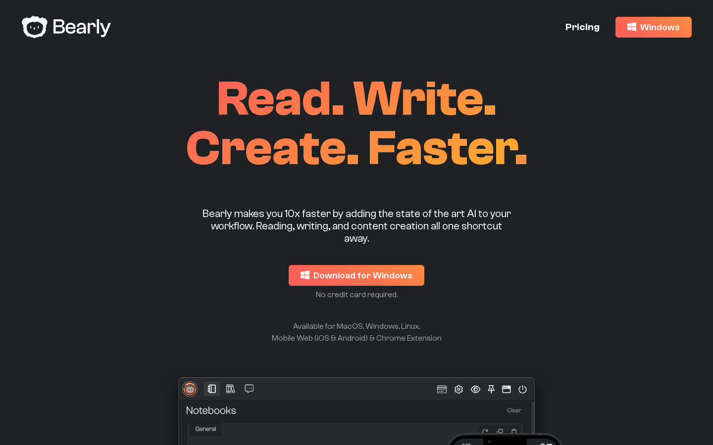 Bearly is a service that allows you to summarize Wikipedia pages and YouTube videos. It is available on various platforms including extension, iOS, Android, macOS, Windows, and Linux. The service offers both free and paid plans, but requires a Google sign in and email.